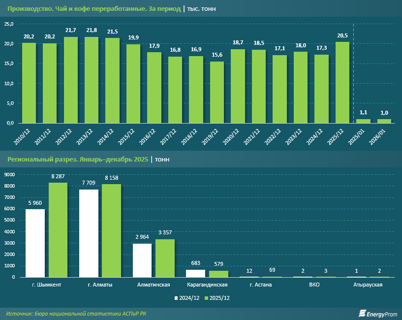 Производство переработанного чая и кофе в Казахстане по итогам января–декабря прошлого года составило 20,5 тыс. тонн — на 18% больше, чем в аналогичном периоде 2024-го (17,3 тыс. тонн). Отрасль вышла на многолетний пик: текущий показатель стал наибольшим с 2014 года, когда в стране было произведено 21,5 тыс. тонн такой продукции. После затяжного периода стагнации 2016–2019 годов, когда объёмы падали до 15,6 тыс. тонн, сектор демонстрирует уверенное восстановление. Тем не менее начало 2026-го ознаменовалось охлаждением темпов: в январе было выпущено менее 1 тыс. тонн чая и кофе — на 8% меньше в сравнении с январём прошлого года.