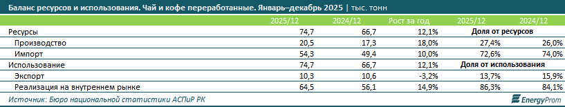 Несмотря на промышленный подъём внутри страны, рынок остаётся импортозависимым. Доля импорта в структуре ресурсов за январь–декабрь 2025 года составила 72,6%, а его объём вырос на 10%, до 54,3 тыс. тонн. Тем не менее позиции казахстанских производителей постепенно укрепляются: удельный вес собственного производства в обеспечении спроса (реализации на внутреннем рынке плюс экспорта) увеличился с 26% в 2024 году до 27,4% в 2025-м.