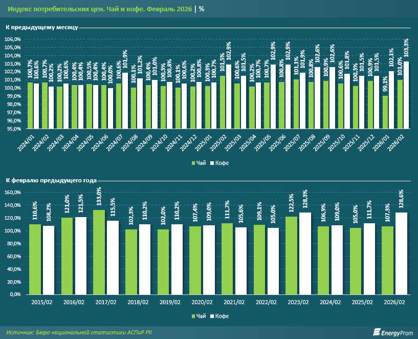 Цены в секторе демонстрируют высокую динамику роста. Только за один месяц кофе в феврале 2026 года подорожал на 3,3%, чай — на 1%. Более того: в отличие от чая кофе дорожает уже 20 месяцев подряд, а удешевления не наблюдается на протяжении 28 месяцев.