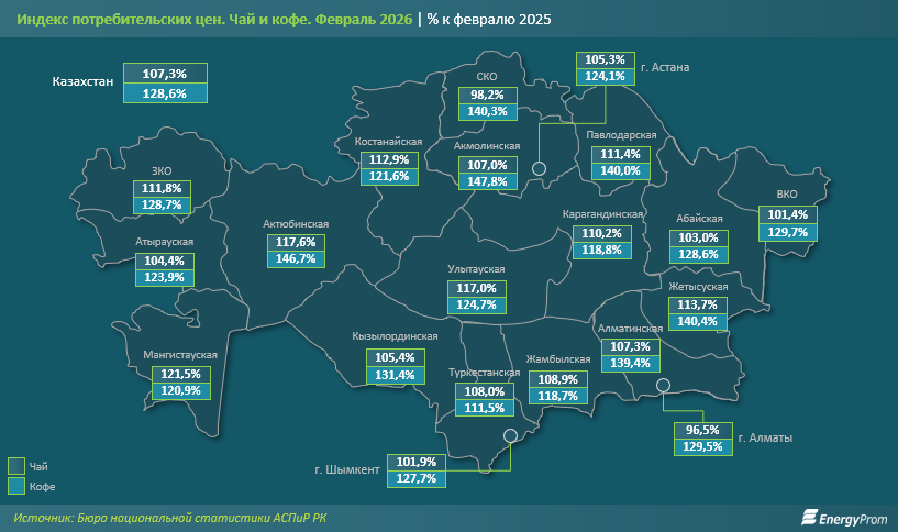 В сегменте чая удорожание затронуло 18 из 20 регионов страны. Наибольший рост цен был зафиксирован в Мангистауской (на 21,5%), Улытауской (на 17%) и Актюбинской (на 17,6%) областях. Наименьшее удорожание среди регионов с плюсовой динамикой наблюдалось в Восточно-Казахстанской области (на 1,4%), Шымкенте (на 1,9%) и Абайской области (на 3%). В то же время в Алматы и Северо-Казахстанской области было зафиксировано снижение стоимости чая в годовом выражении: на 3,5% и на 1,8% соответственно.
