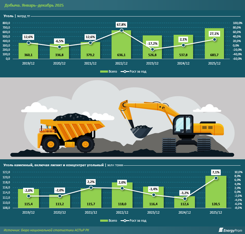 В натуральном выражении объём добычи каменного угля, включая лигнит и угольный концентрат, за январь–декабрь прошлого года составил 120,5 млн тонн, что стало наибольшим показателем за последние десять лет. По сравнению с январём–декабрём 2024-го добыча выросла на 7,1%.
