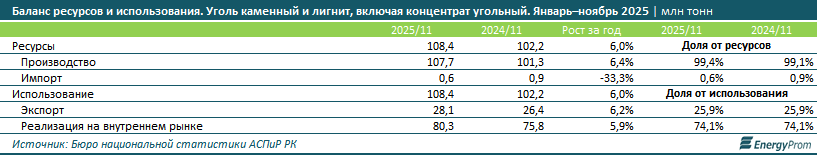 Казахстанские угольные шахты обеспечивают спрос (реализацию на внутреннем рынке плюс экспорт) практически на 100%. За январь–ноябрь 2025 года было добыто 107,7 млн тонн угля, рост за год — на 6,4%. Импорт за тот же период сократился на треть, до 620,2 тыс. тонн.
