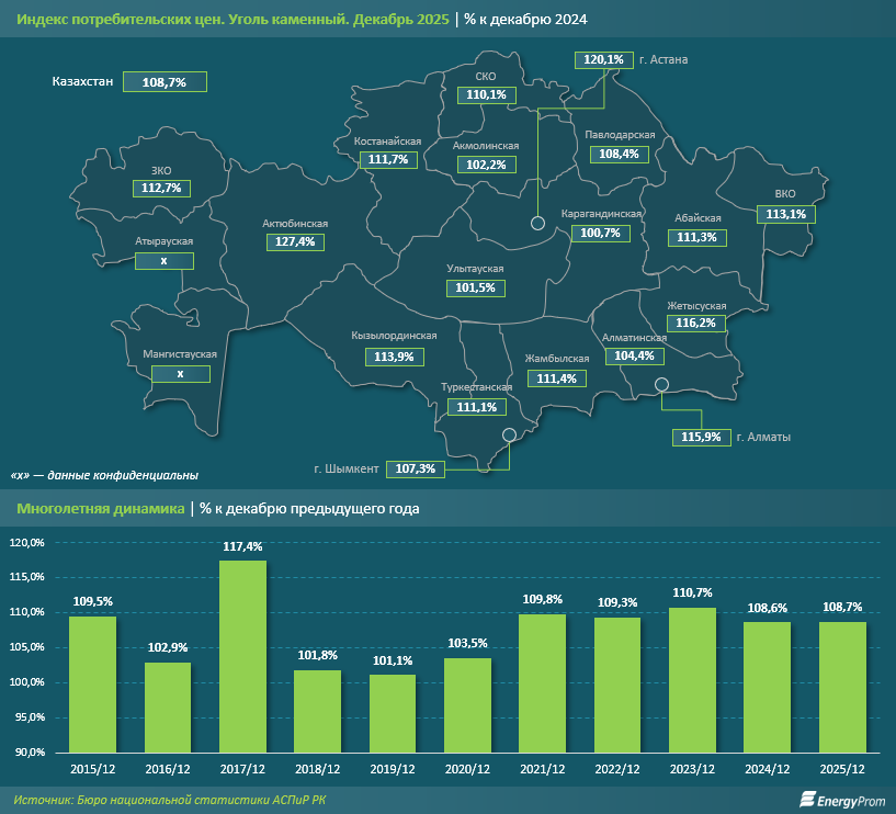 В региональном разрезе годовой рост стоимости каменного угля варьировался от 0,7% в Карагандинской до 27,4% в Актюбинской области. Заметное годовое удорожание было также отмечено в Астане (на 20,1%), Жетысуской области (на 16,2%) и Алматы (на 15,9%).