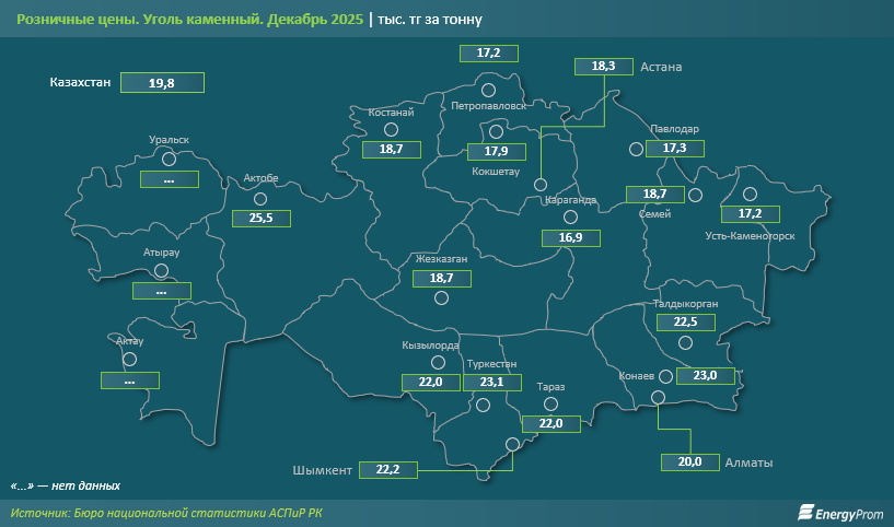 Розничная цена одной тонны каменного угля в среднем по Казахстану в декабре 2025 года составляла 19,8 тыс. тг. Дешевле всего уголь обходился жителям Караганды: 16,9 тыс. тг за тонну. Следом идут Петропавловск и Усть-Каменогорск: по 17,2 тыс. тг в каждом из городов.