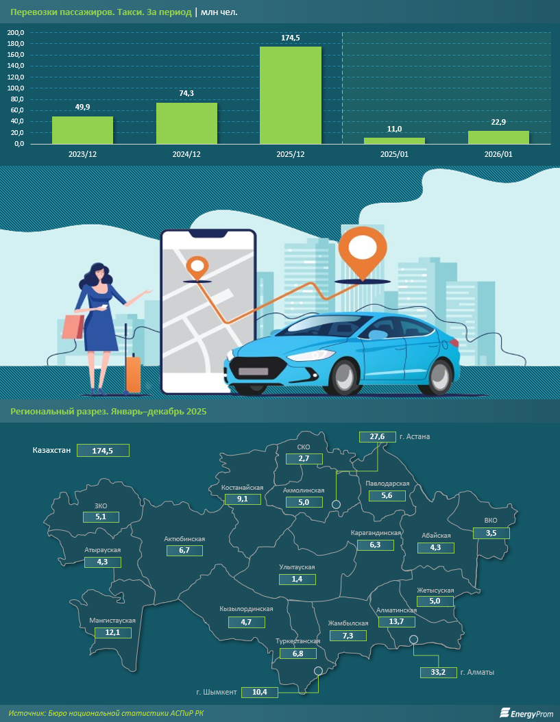 За январь–декабрь 2025-го казахстанские такси перевезли 174,5 млн пассажиров — в 2,4 раза больше, чем годом ранее, и в 3,5 раза больше, чем за январь–декабрь 2023-го. Рост носит устойчивый характер и не является разовым всплеском. Для сравнения: в январе 2026-го было перевезено 22,9 млн человек — в 2,1 раза больше, чем в январе 2025-го. Таким образом, тенденция сохраняется и в начале текущего года.