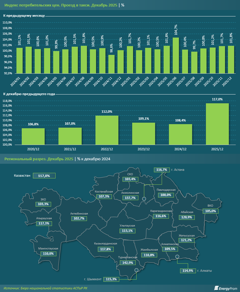 Услуги такси в РК по итогам декабря прошлого года подорожали на 1,8% за месяц. На протяжении 2025-го цены повышались почти ежемесячно. Единственным исключением стал август, когда было зафиксировано снижение, но лишь на 0,3%. Самый резкий скачок произошёл в июне: сразу на 4,7% за месяц.