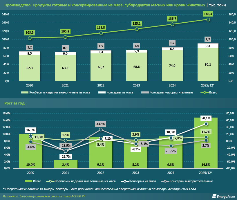 В Казахстане наблюдается устойчивый рост производства готовых или консервированных мясных продуктов. Так, согласно данным Бюро национальной статистики АСПиР РК, за январь–декабрь прошлого года казахстанские производители выпустили 9,3 тыс. тонн мясных консервов — сразу на 50,1% больше, чем за аналогичный период 2024-го. И объём выпуска, и его годовой рост стали максимальными показателями в секторе за последние годы. Ранее динамика была неравномерной: так, в 2021 году наблюдалось даже уменьшение объёма до 6 тыс. тонн. Важное методологическое примечание: рост объёмов производства за январь–декабрь 2025 года, как по категории в целом, так и по видам продукции, рассчитан в сравнении с оперативными данными 2024 года. За предыдущие годы уже есть уточнённые данные, которые приведены в графиках ниже.