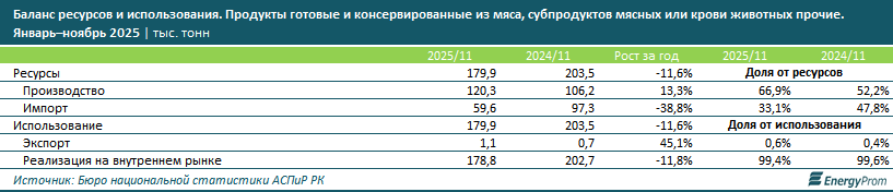 Данные по ресурсам и использованию готовых и консервированных мясных продуктов за январь–ноябрь 2025 года демонстрируют смещение баланса в пользу отечественных производителей. Рост выпуска продукции за период составил 13,3%, в то время как импорт просел сразу почти на 39%. В результате доля отечественного производства в общем объёме ресурсов увеличилась с 52,2% до 66,9%, а доля импорта, напротив, сократилась с 47,8% до 33,1%.