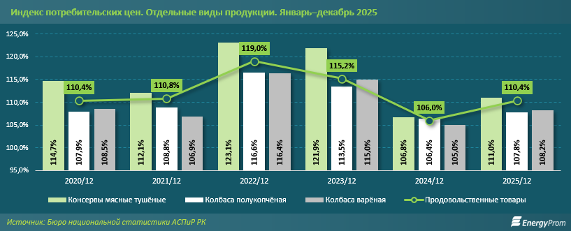 Причин роста цен несколько. Это и общее инфляционное увеличение расходов производства, и рост издержек, и удорожание сырья. В декабре прошлого года мы писали о том, как сильно в 2025-м подорожало мясо. По итогам ноября этот важный для казахстанских семей товар стал дороже на 21,7%. Чиновники назвали это явлением «мясной инфляцией». На рост цен на мясную продукцию, в свою очередь, повлияли удорожание кормов, более активный экспорт, повышение тарифов на коммунальные услуги.