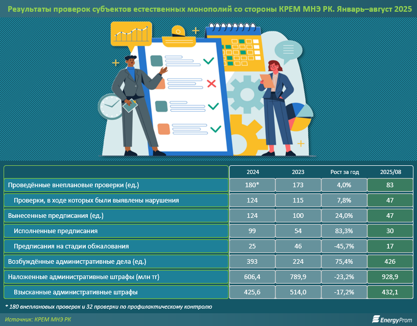 За январь–август текущего года КРЕМ МНЭ РК уже провёл 83 внеплановые проверки, при этом нарушения были выявлены в 47 случаях. По результатам было вынесено 47 предписаний, 30 из которых уже исполнены. За этот период были возбуждены 426 административных дел в отношении СЕМ, наложены административные штрафы на весомые 928,9 млн тг, из которых уже взысканы 432,1 млн тг.