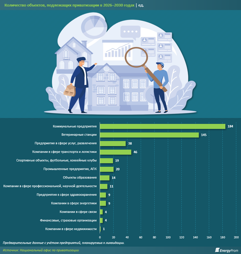 Новая волна приватизации будет проводиться в три этапа: 2026 год, 2027-2028 годы и 2029-2030 годы. Утверждённый перечень объектов приватизации состоит из 473 предприятий. Правда, на сайте Национального офиса по приватизации опубликован список из 504 объектов. Часть из них повторяется или имеет статус «подлежат ликвидации». Паспорта объектов пока не готовы.