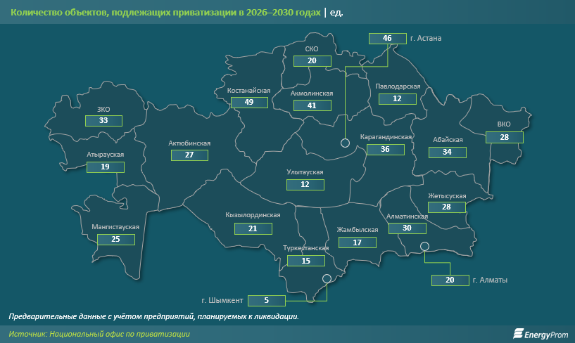 В региональном разрезе распределение неравномерно. Больше всего объектов придётся на Костанайскую область (49), Астану (46) и Акмолинскую область (41). Практически в каждом регионе в числе приватизируемых предприятий обязательно есть коммунальные компании, которые отвечают за тепло- и водоснабжение.