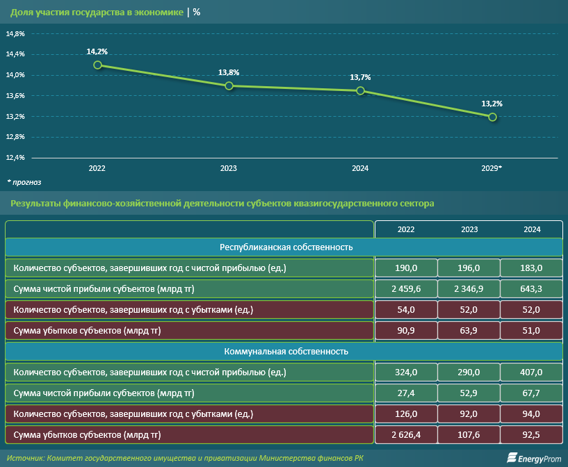В конце ноября Комитет государственного имущества и приватизации опубликовал Национальный доклад по управлению государственными активами и квазигосударственным сектором за 2024 год. В документе представлены расширенные данные о прибыли и убытках компаний с государственным участием. Рассмотрим одну из важнейших категорий таких предприятий — субъекты квазигосударственного сектора, которые нередко становятся претендентами на приватизацию и приносят по её итогам больше всего денег. Это компании с такими формами собственности, как РГП на ПХВ, АО, РГКП, ТОО. Ситуация с их финансовой деятельностью неоднозначна.