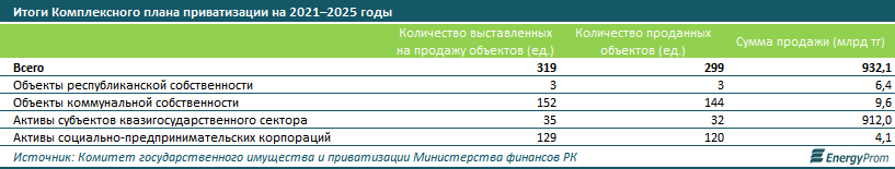 Согласно данным Комитета государственного имущества и приватизации, за этот период было выставлено для приватизации 319 объектов. Из них почти половина (152) пришлась на предприятия коммунальной собственности, а ещё 129 — на активы социально-предпринимательских корпораций. В рамках кампании были проданы и переданы в доверительное управление 299 объектов. Общая сумма, полученная бюджетом за прошедшую волну приватизации, составила 932,1 млрд тг. Большая часть всего объёма — 912 млрд тг — была получена за реализацию именно активов квазигосударственного сектора.