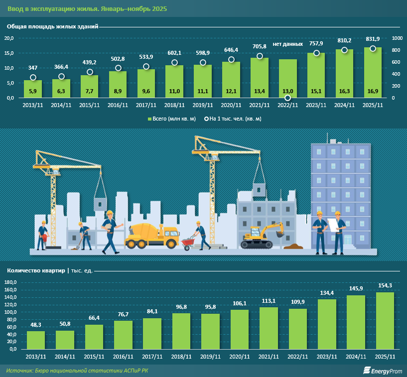Итак, за неполный год (11 месяцев, январь–ноябрь 2025-го) общая площадь введённого в эксплуатацию жилья увеличилась по сравнению с аналогичным периодом 2024-го на 3,9%, достигнув рекордных 16,9 млн кв. м. Из них 10,9 млн кв. м пришлось на многоквартирные дома, 5,9 млн кв. м — на индивидуальные. В пересчёте на 1 тыс. человек в РК сдали 831,9 кв. м жилья — на 2,7% больше, чем годом ранее. Количество введённых в эксплуатацию квартир также продемонстрировало очередной рекорд: 154,3 тыс., плюс 5,7% за год.