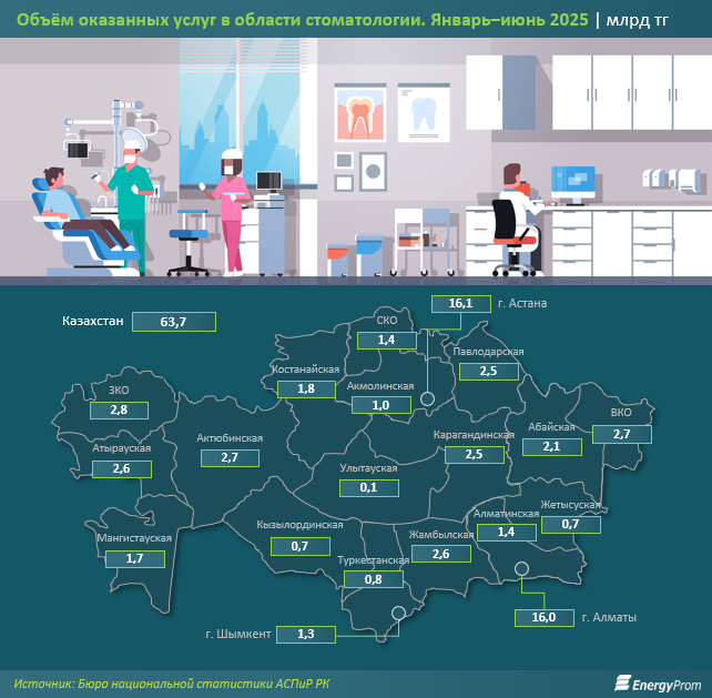 В региональном разрезе наибольший объём стоматологических услуг пришёлся на Астану: 16,1 млрд тг, против 11,8 млрд тг годом ранее (рост — на 36,1%). На втором и третьем местах расположились Алматы (16 млрд тг) и Западно-Казахстанская область (2,8 млрд тг). В пятёрку лидеров также вошли Восточно-Казахстанская и Актюбинская области (по 2,7 млрд тг в каждом из регионов).
