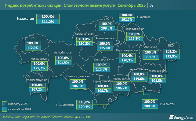 В годовой динамике удорожание стоматологических услуг было зафиксировано во всех регионах страны. Наибольший рост цен был отмечен в Атырауской (на 29,7%) и Улытауской (на 26,6%) областях, а также в Шымкенте (на 20,4%), наименьший — в Жетысуской области (на 1,8%), Астане (на 2,7%) и Туркестанской области (на 3,7%).
