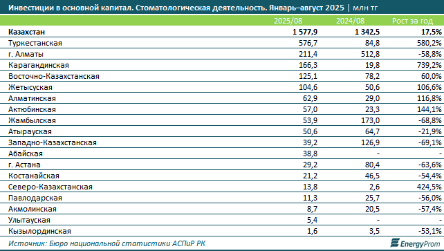 Инвестиции в основной капитал в сфере стоматологической деятельности за январь–август текущего года составили 1,6 млрд тг — на 17,5% больше в стоимостном выражении, чем за аналогичный период 2024-го.