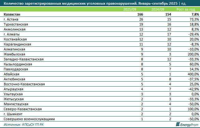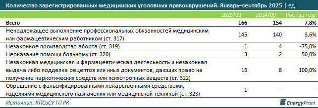 Заметим: с начала года в РК зарегистрировали 166 медицинских уголовных правонарушений — на 7,8% больше, чем за январь–сентябрь 2024-го. Численность совершивших такие правонарушения увеличилась с 17 до 28 человек.
