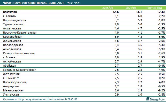 В региональном разрезе больше всего умерших в первом полугодии 2025-го пришлось на Алматы: 6,1 тыс. человек, против 6 тыс. человек годом ранее. Далее следуют Карагандинская (5,2 тыс. человек), Туркестанская (4,9 тыс. человек), Алматинская (4,6 тыс. человек) и Восточно-Казахстанская (4 тыс. человек) области. Наименьшие показатели численности умерших были зарегистрированы в Улытауской (933 человека), Мангистауской (1,6 тыс. человек) и Атырауской (1,7 тыс. человек) областях.