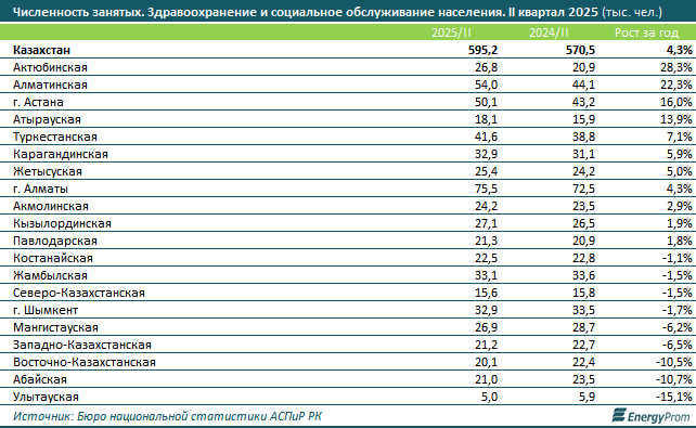 Во втором квартале текущего года в сфере здравоохранения и социального обслуживания населения в Казахстане были заняты 595,2 тыс. человек — на 4,3% больше, чем в аналогичном периоде 2024-го.