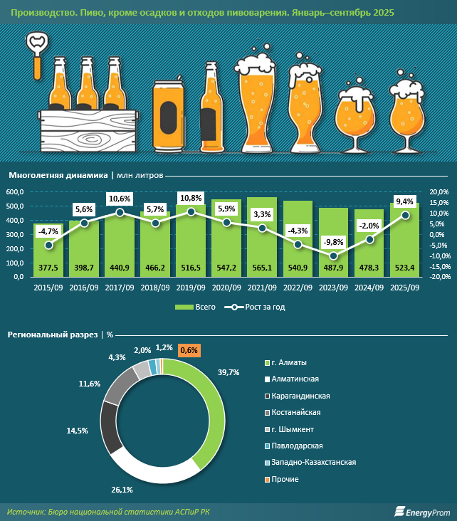 Объём производства пива в Казахстане за январь–сентябрь текущего года составил 523,4 млн литров — на 9,4% больше, чем за аналогичный период 2024-го. Предыдущие три года выпуск сокращался: в 2024-м — на 2%, в 2023-м — на 9,8%, в 2022-м — на 4,3%.