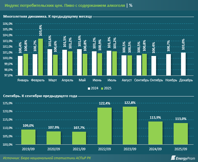 Спрос со стороны казахстанцев на пиво лишь дополнительно подстёгивает рост цен. Снижение стоимости пива с содержанием алкоголя в РК не было зафиксировано уже 81 месяц подряд, при этом непрерывное удорожание наблюдается 44 месяца кряду. В сентябре 2025-го цены на пиво увеличились на 0,8% за месяц, в августе — на 0,5%, в сентябре прошлого года — также на 0,5%. Самый заметный скачок стоимости в текущем году был зафиксирован в феврале: сразу на 3,4%.