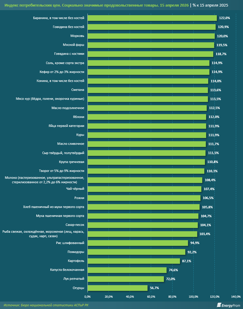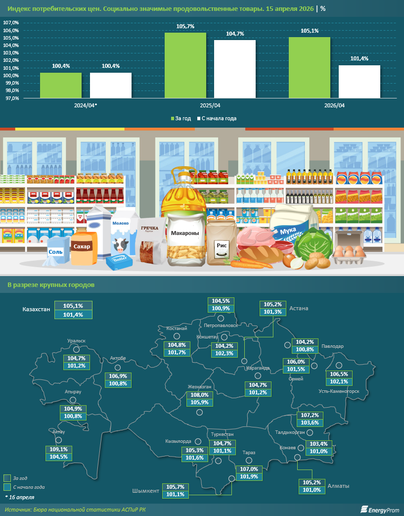 По итогам середины апреля 2026 года ситуация на рынке социально значимых продовольственных товаров (СЗПТ) остаётся напряжённой. Несмотря на некоторое замедление темпов удорожания по сравнению с аналогичным периодом прошлого года, ценовое давление на кошельки граждан сохраняется. Ситуация осложняется тем, что в текущем году перечень СЗПТ был существенно расширен: с 19 до 31 позиции. В список вошли дополнительные категории мясной и молочной продукции, овощей и бакалейных товаров, что требует от местных исполнительных органов более широкого охвата мониторинга.