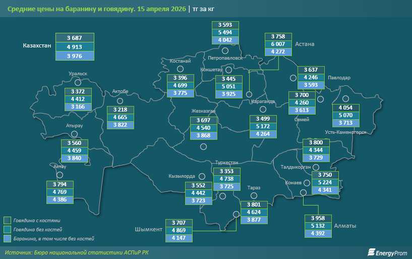 Ценовая ситуация подтверждается и уровнем средних цен. Так, в среднем по стране говядина с костями на 15 апреля стоила 3,7 тыс. тг за кг, говядина без костей — 4,9 тыс. тг, баранина, в том числе без костей — около 4 тыс. тг. Астана выделялась аномально высокой стоимостью бескостной говядины (более 6 тыс. тг за кг), в то время как в Усть-Каменогорске и Алматы были зафиксированы наибольшие цены на говядину с костями (4,1 тыс. и 4 тыс. тг соответственно), а самая дорогая баранина продавалась в Алматы и Актау (по 4,4 тыс. тг за кг).