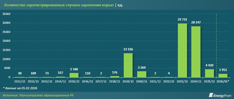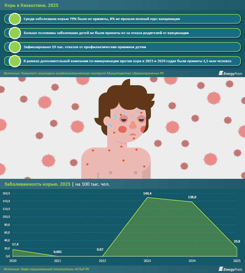 Исторические данные показывают: последние десятилетия в Казахстане наблюдается нестабильная динамика количества случаев заражения этой инфекцией. В отдельные периоды страну можно было даже назвать территорией, свободной от кори: единичные факты фиксировались в 2017, 2021, 2022 годах. Самая серьёзная вспышка произошла в 2023 и 2024 годах, когда счёт шёл уже на десятки тысяч заболевших: до 29,7 тыс. человек в 2023-м.