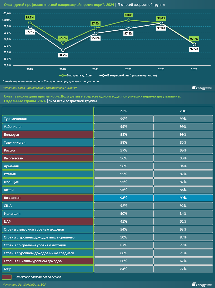 Отрицательная динамика охвата прививками детей в возрасте до 2 лет поставила Казахстан в число стран, которые откатились назад в своих программах иммунизации населения против кори за период с 2005 по 2024 год. Среди них Россия, Кыргызстан, Беларусь, Мексика, Молдова, Финляндия, Нидерланды, Япония и другие. Общемировая тенденция иная: за эти два десятилетия средний уровень вакцинации малышей первой прививкой против кори, напротив, вырос на семь процентных пунктов, с 77% до 84%.