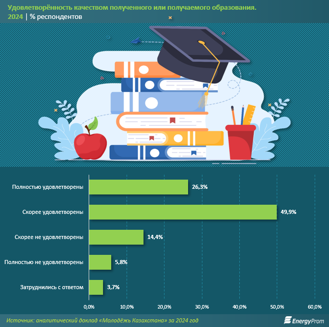 В 2024 году, согласно аналитическому докладу «Молодёжь Казахстана», 76,2% опрошенных молодых людей были в достаточной мере удовлетворены качеством полученного или получаемого образования. Из них 26,3% были полностью удовлетворены, а 49,9% — скорее удовлетворены. При этом 20,2% респондентов выразили неудовлетворённость качеством образования: 14,4% были скорее не удовлетворены, а 5,8% — полностью не удовлетворены.