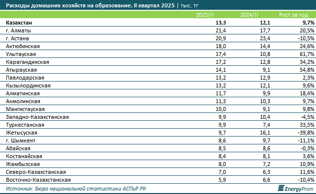 В региональном разрезе больше всего на образование потратили жители Алматы: 21,4 тыс. тг в квартал на семью, против 17,7 тыс. тг годом ранее. Годовой рост расходов составил 20,5%. На втором и третьем местах расположились Астана (20,9 тыс. тг) и Актюбинская область (18 тыс. тг). Меньше всех на образование потратили жители Восточно-Казахстанской (5,9 тыс. тг в квартал на домохозяйство), Северо-Казахстанской (7 тыс. тг) и Жамбылской (8 тыс. тг) областей.
