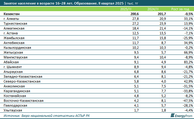 Заметим: в целом в сфере образования в РК во втором квартале текущего года были заняты уже 1,2 млн человек — на 2,5% больше, чем в аналогичном периоде 2024-го. В то же время среди них насчитывалось лишь 200,6 тыс. молодых людей, против 201,7 тыс. человек годом ранее. Доля молодёжи в возрасте от 16 до 28 лет, занятой в сфере образования, сократилась по сравнению со вторым кварталом прошлого года с 16,9% до 16,4%.