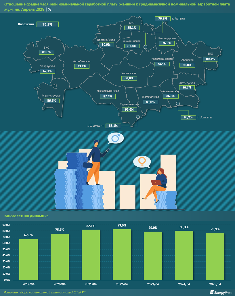 В мегаполисах ситуация заметно варьировалась: в Шымкенте женщины получали 88,1% от уровня мужчин, в Алматы — 80,2%, в Астане — 76,9%.