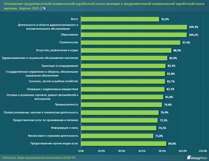 Гендерный разрыв в оплате труда в Казахстане остаётся устойчивым и значительным, несмотря на отдельные периоды улучшения. По итогам апреля прошлого года среднемесячная номинальная заработная плата женщин составила лишь 76,9% от среднемесячной номинальной заработной платы мужчин. Это означает, что в среднем женщины зарабатывают почти на четверть меньше, чем мужчины, при сопоставимом участии в экономике: 77 тиын к 1 тенге соответственно.