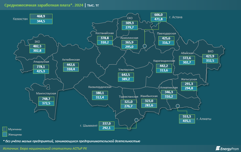 Схожая картина наблюдается и при анализе абсолютных значений заработных плат*. По итогам 2024 года мужчины в среднем зарабатывали 468,9 тыс. тг, против 344,5 тыс. тг у женщин, что соответствует разнице в 26,5%. Наиболее значительный разрыв был отмечен в Мангистауской области, где заработная плата у женщин оказалась в 2 раза меньше, чем у мужчин: 748,7 тыс. тг против 372,5 тыс. тг. В Атырауской области женщины зарабатывали на 45,3% меньше, в Улытауской — на 39,4% меньше, чем мужчины. При этом именно эти регионы демонстрируют одни из самых высоких уровней зарплат в стране. Таким образом, высокая номинальная оплата труда сопровождается и более выраженным гендерным неравенством.