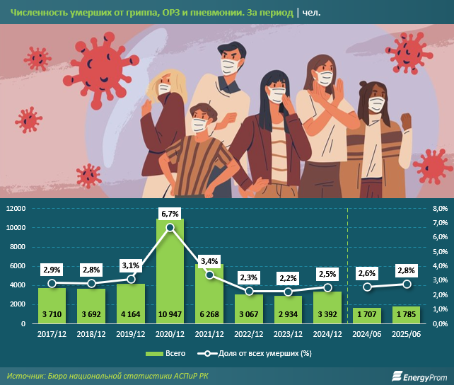 На фоне начала осенне-зимнего сезона в Казахстане актуальным становится вопрос, как изменилась численность умерших от гриппа, ОРЗ и пневмонии в последние годы и какие регионы наиболее подвержены рискам.