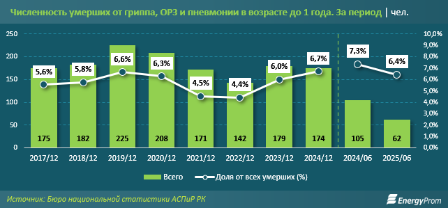 Численность детей в возрасте до 1 года, умерших от гриппа, ОРЗ и пневмонии, за полный 2024 год составила 174 человек — на 2,8% меньше, чем за 2023-й. За январь–июнь текущего года от этих заболеваний умерли 62 ребёнка — сразу на 41% меньше, чем за аналогичный период 2024-го.