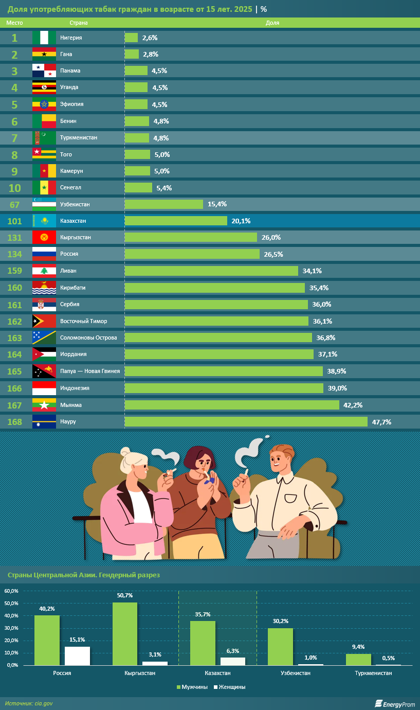 Стоит отметить: на начало 2025 года в Казахстане проживали 14,4 млн человек в возрасте от 15 лет, среди них насчитывалось 6,9 млн мужчин и 7,5 млн женщин. По данным The World Factbook от ЦРУ США, в этой возрастной группе табак употреблял каждый пятый, что эквивалентно примерно 2,9 млн человек. Из них 2,5 млн пришлось на мужчин (уже упомянутые 35,7% мужского населения), менее 0,5 млн — на женщин (также упомянутые 6,3% женского населения). Таким образом, почти 85% курильщиков страны составляют мужчины.