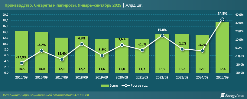 По итогам января–сентября текущего года производство сигарет и папирос в Казахстане достигло 17,4 млрд штук — на 34,5% больше, чем за аналогичный период 2024-го. Это наибольший показатель за последнее десятилетие.