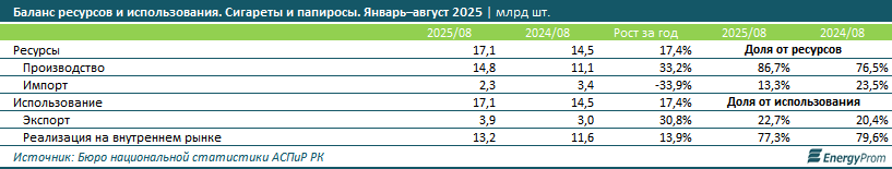 Экспорт, напротив, показал рост сразу на 30,8%, до 3,9 млрд штук за январь–август 2025 года. Объём реализации на внутреннем рынке увеличился на 13,9%, достигнув 13,2 млрд штук.
