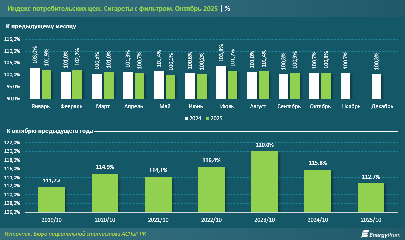 По итогам октября 2025 года цены на сигареты с фильтром в Казахстане выросли на 0,8% за месяц. Месяцем ранее наблюдалось удорожание на 0,9%, а в октябре 2024-го — на 0,7%. Самый заметный рост цен на сигареты в текущем году был отмечен в феврале (на 2,2%), а в прошлом году — в июле (сразу на 3,8%). Стоит отметить: удорожание в секторе наблюдается уже 77 месяцев подряд.