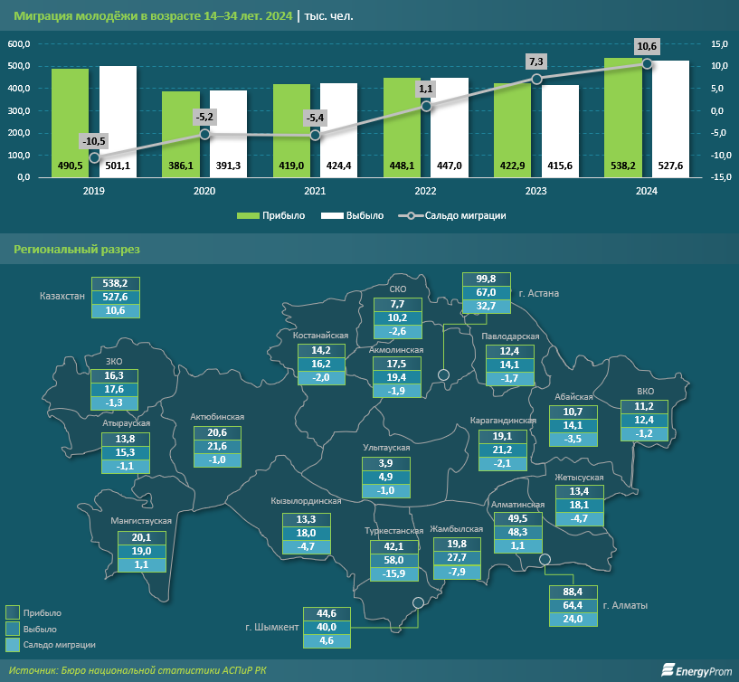 В 15 из 20 регионов РК (за исключением всех трёх мегаполисов, а также Мангистауской и Алматинской областей) сальдо молодёжной миграции было отрицательным. То есть оттуда уезжало больше молодых людей, чем приезжало. Главными принимающими городами стали обе столицы: в Астану только за прошлый год переехали 99,7 тыс. молодых казахстанцев, в Алматы — немного меньше, 88,4 тыс. человек. Несмотря на то, что из мегаполисов молодёжь в возрасте от 14 до 34 лет также уезжала, сальдо миграции там тем не менее оставалось положительным и самым высоким в стране: в Астане — 32,7 тыс. человек, в Алматы — 24 тыс. человек. Суммарная доля обеих столиц в общей численности прибывшей молодёжи составила 48,9%.