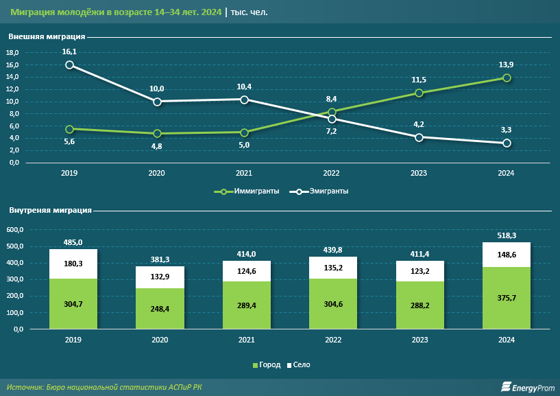 Что же касается внутренней миграции молодёжи, по итогам прошлого года внутри страны переезжали 518,3 тыс. человек. Большую часть из них составили жители городов (357,7 тыс. человек), меньшую — сельчане (148,6 тыс. человек). Чаще всего молодёжь из аулов переезжала в города — как в пределах своего региона, так и вне его. Наиболее активно уезжали из сёл молодые люди из южных регионов — Алматинской, Туркестанской и Жамбылской областей. Последние несколько лет сальдо молодёжной миграции в сёлах было отрицательным во всех регионах, за исключением Алматинской области. Это происходит за счёт общего роста миграционного потока в Алматинскую агломерацию.