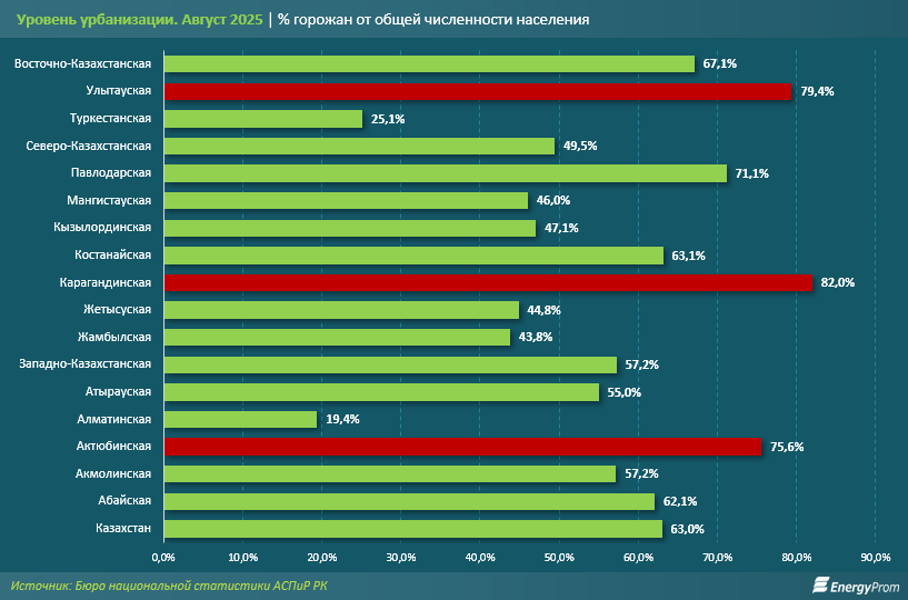 Отметим: в отдельных регионах страны уровень урбанизации в августе текущего года был значительно выше среднереспубликанского. К примеру, в Карагандинской области он составил 82%, в Улытауской — 79,4%, в Актюбинской — 75,6%. При этом в стране есть регионы, где сельское население составляет большинство. Это относится, например, к Туркестанской области, где почти 75% населения живут в сёлах. Аналогичная ситуация наблюдается и в Алматинской области: почти 80% граждан составляют сельские жители.