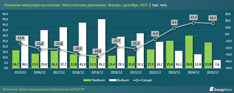 В 2025 году внешняя миграция населения РК сохранила положительное сальдо на уровне плюс 16,2 тыс. человек. Плюсовая динамика сохраняется третий год подряд после исторического перелома в 2023-м, когда сальдо впервые за 11 лет стало положительным (плюс 9,3 тыс. человек). В 2025 году прибыло 23,8 тыс. человек, а выбыло 7,6 тыс. человек.