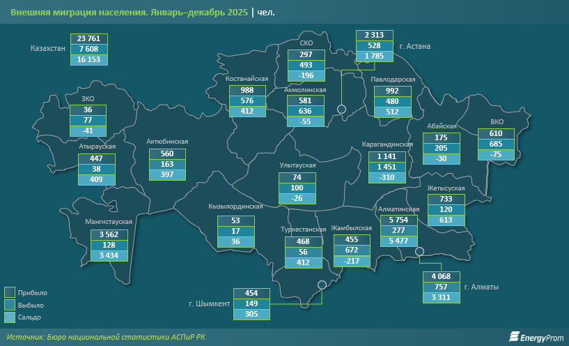 В то же время отрицательное сальдо сохранилось в ряде северных и индустриальных регионов, включая Карагандинскую (минус 310 человек), Жамбылскую (минус 217 человек), Северо-Казахстанскую (минус 196 человек) и Восточно-Казахстанскую (минус 75 человек) области.