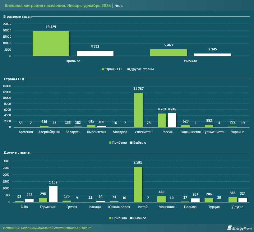 В разрезе стран ключевым источником прироста остаются государства СНГ, откуда за январь–декабрь 2025 года прибыло 19,4 тыс. человек, а выбыло туда на 14 тыс. человек меньше (5,5 тыс. человек). Абсолютным драйвером выступил Узбекистан, обеспечивший сальдо в плюс 11,7 тыс. человек: прибыло 11,8 тыс. человек, выбыло лишь 78 человек. Существенный вклад также внесли Таджикистан (плюс 622 человека), Туркменистан (плюс 878 человек), Кыргызстан (плюс 215 человек) и Азербайджан (плюс 394 человека). При этом с Россией баланс оказался практически нулевым: прибыло 4,7 тыс. человек, выбыло также 4,7 тыс. человек, а сальдо составило минус 46 человек.