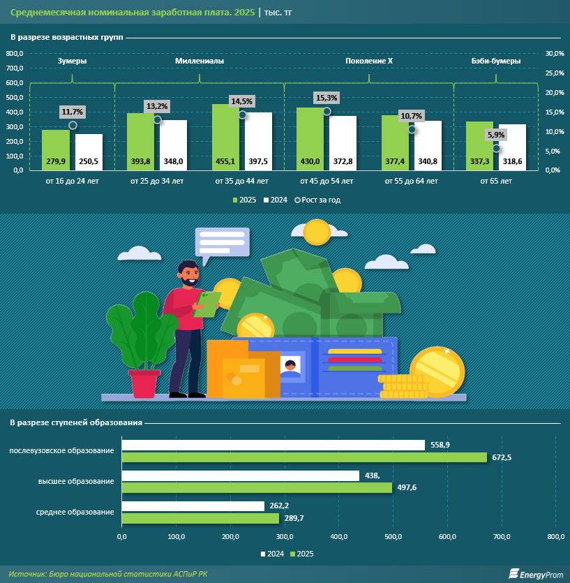 Больше всех в разрезе возрастных групп зарабатывают так называемые миллениалы — люди, рождённые в период от начала 80-х до середины 90-х. В статистике БНС под эту категорию подходят две группы: 25–34 года и 35–44 года. Именно работники в среднем возрасте от 35 до 44 лет, как правило, уже имеющие довольно весомый стаж работы, получают самую наибольшую среднюю номинальную зарплату. В текущем году она достигает 455,1 тыс. тг. Им немного уступают представители поколения Х в возрасте от 45 до 54 лет, чья зарплата составляет 430 тыс. тг. Меньшие зарплаты получают казахстанцы постарше (377,4 тыс. тг) и работающие пенсионеры (337,3 тыс. тг).